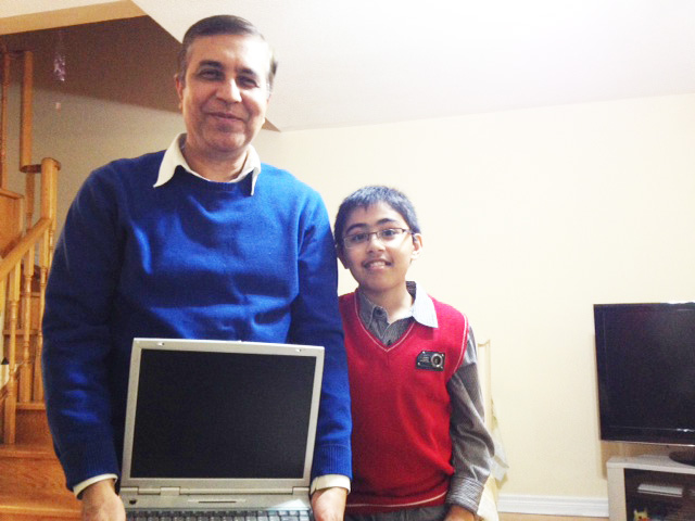 !0-year-old Tanmay seen here with his dad and teacher Puneet Bakshi. Puneet proudly shows of the laptop that Tanmay broke when he was a mere toddler.